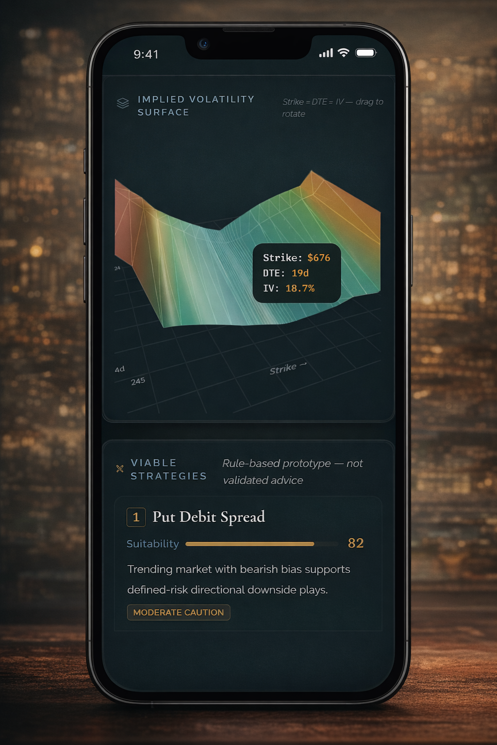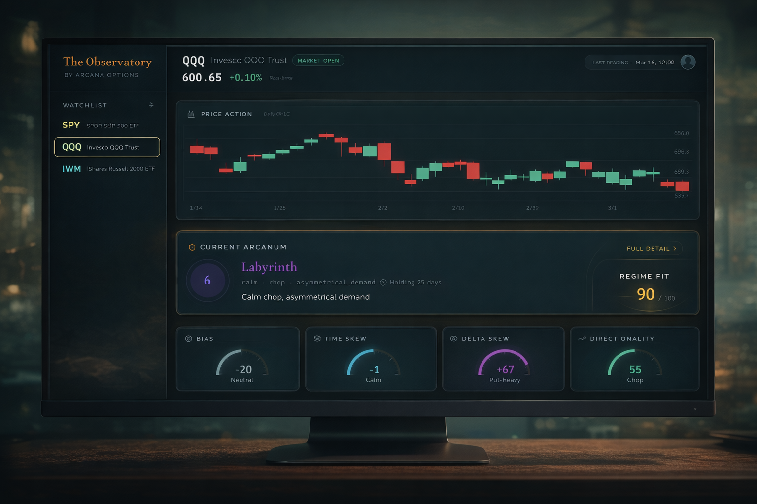 The Observatory is our homebrewed dashboard with the current market arcanum, gauges for metrics, an interactive 3D volatility surface, recent transitions and overall regime distribution, most and least viable strategies, and even what might come next.